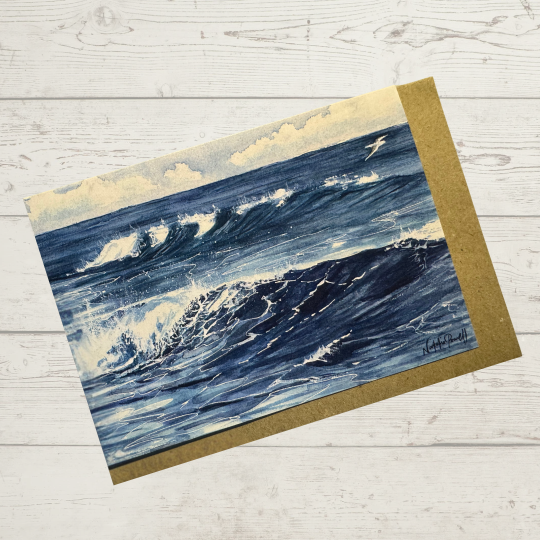 Impresión de una acuarela original de olas invernales que evoca una sutil estética japonesa con sus tonos de azul profundo en una tarjeta de felicitación A6, en blanco por dentro. Viene con un sobre de papel kraft de color natural, empaquetado en un sobre de celofán para su envío. Esta imagen también está disponible como impresión de tamaño A4 o A3 en papel de trapo 100 % algodón de 310 g/m².