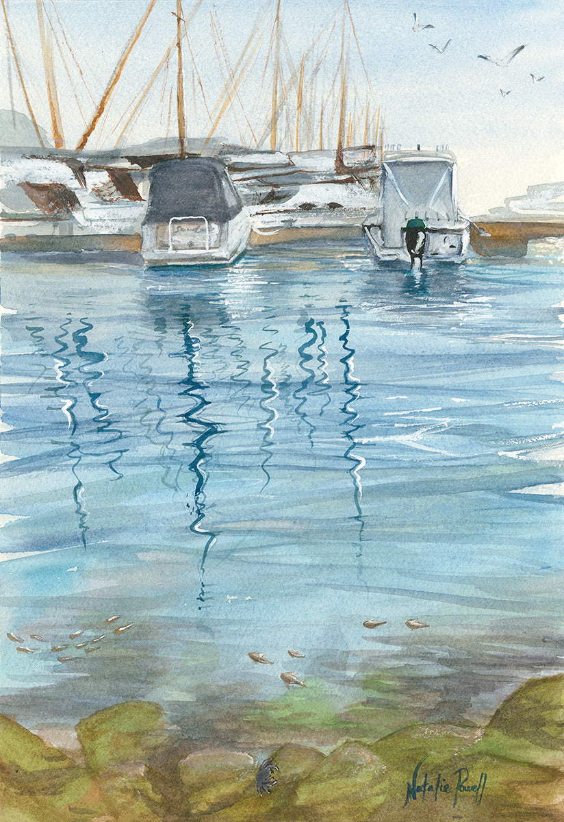 Print of an original watercolour painting of boats moored at the Mindarie Marina, Perth Western Australia on A6 greeting card, blank inside. Comes with natural coloured kraft envelope, packaged in cellophane envelope for shipping. This image is also available as an A4 or A3 sized print on 310 gsm 100% cotton rag paper.
