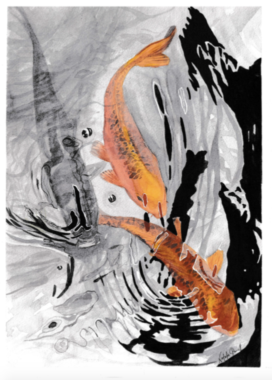 Three playful Koi fish rise to the surface of a pond, curious and animated as they explore their watery home. One of three artistic representations in a sequence of Koi explorations. A peaceful, original watercolour painting, truly one of a kind, sure to captivate on its own or as part of a trio. Ideal for modern or contemporary-Asian inspired homes with bold and striking decor, or for injecting a pop of colour to any room and creating a sense of dimension. The painting is on A3 sized 300 gsm 100% cotton watercolour paper. Actual painting size is 27.5cm x 39.5cm. This painting comes unframed and will be shipped flat with a protective foam backing board. Discount if purchasing all three in the series.